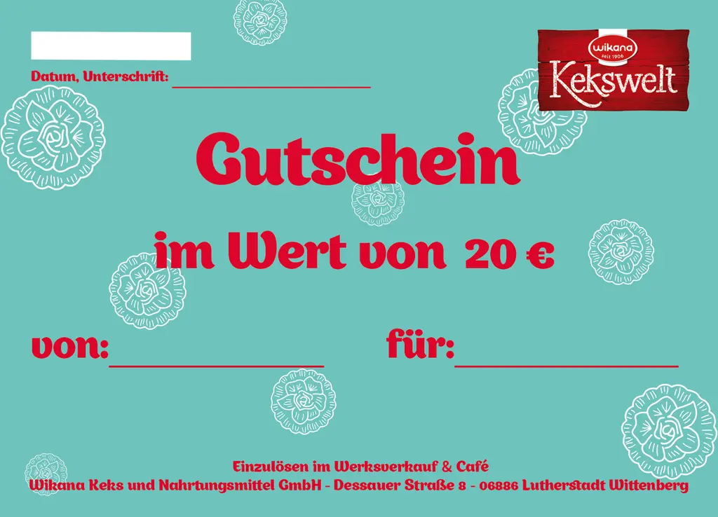 Dieser Gutschein ist ausschließlich in der Wikana Kekswelt (Werksverkauf und Café) einlösbar und hat einen Wert von 20 €.