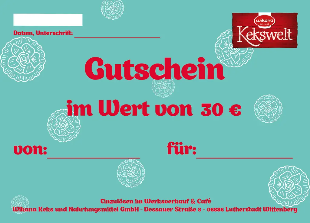 Dieser Gutschein ist ausschließlich in der Wikana Kekswelt (Werksverkauf und Café) einlösbar und hat einen Wert von 30 €.